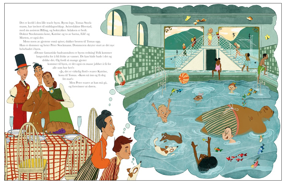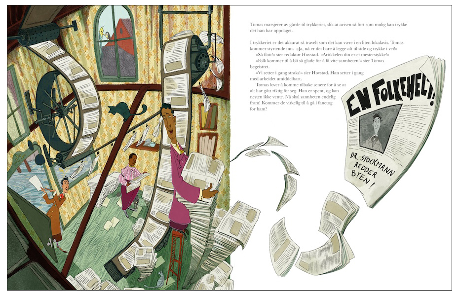 Begge bøkene er prydet med vakre illustrasjoner, som et viktig bidrag til leseropplevelsen. I En folkefiende møter vi hele persongalleriet allerede på bokpermens innside, der hver av figurene har en karikert og teatralsk fremtoning. Her er det verdt å trekke frem Dr. Stockmanns svigerfar, gestaltet som en oppstyltet eksentriker med lang frakk og et hode som henger utenfor kroppen. Det lille portrettet på tittelsiden, av Henrik Ibsen med sin brede kropp og lange føtter, har også en herlig originalitet. Illustratør Sunniva Fluge Hole ivaretar det teatralske preget gjennom hele boken, der hver side fremstår som en scene, skildret med levende og humoristisk penn. Bybildene, situasjonene og interiørene er innbydende og rikt detaljerte. Her kan man se referanser til De løyerlige familier, Disney og Carl Larsson, for å nevn