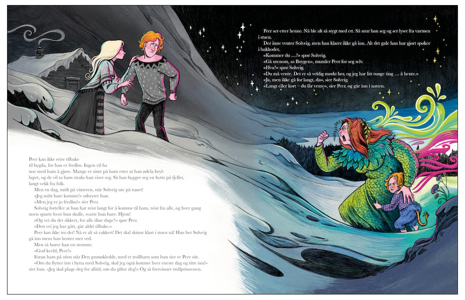 Mæland underbygger den illusoriske stemningen med ornamentale og folkloristiske elementer. Dette fungerer på sitt beste i bokomslaget, der Peer er omkranset av subtile bruddstykker fra historien, utformet som vakre prydformer. Scenen der Peer tar farvel med mor Åse midt i boken er også verdt å fremheve. Her ser vi et utsnitt av Peer som sørger over sin døde mor i sengen. På venstre side av himmelen følger han henne, i hest og slede, opp mot stjernene. På himmelens høyre side ser vi at mor Åse blir tatt imot av en engel. Begge fragmentene er innrammet av folkloristiske mønstre på en nattsvart bakgrunn. Scenen er det visuelle høydepunktet i Conradis Peer Gynt, der bildene og teksten utfyller hverandre på utsøkt vis.